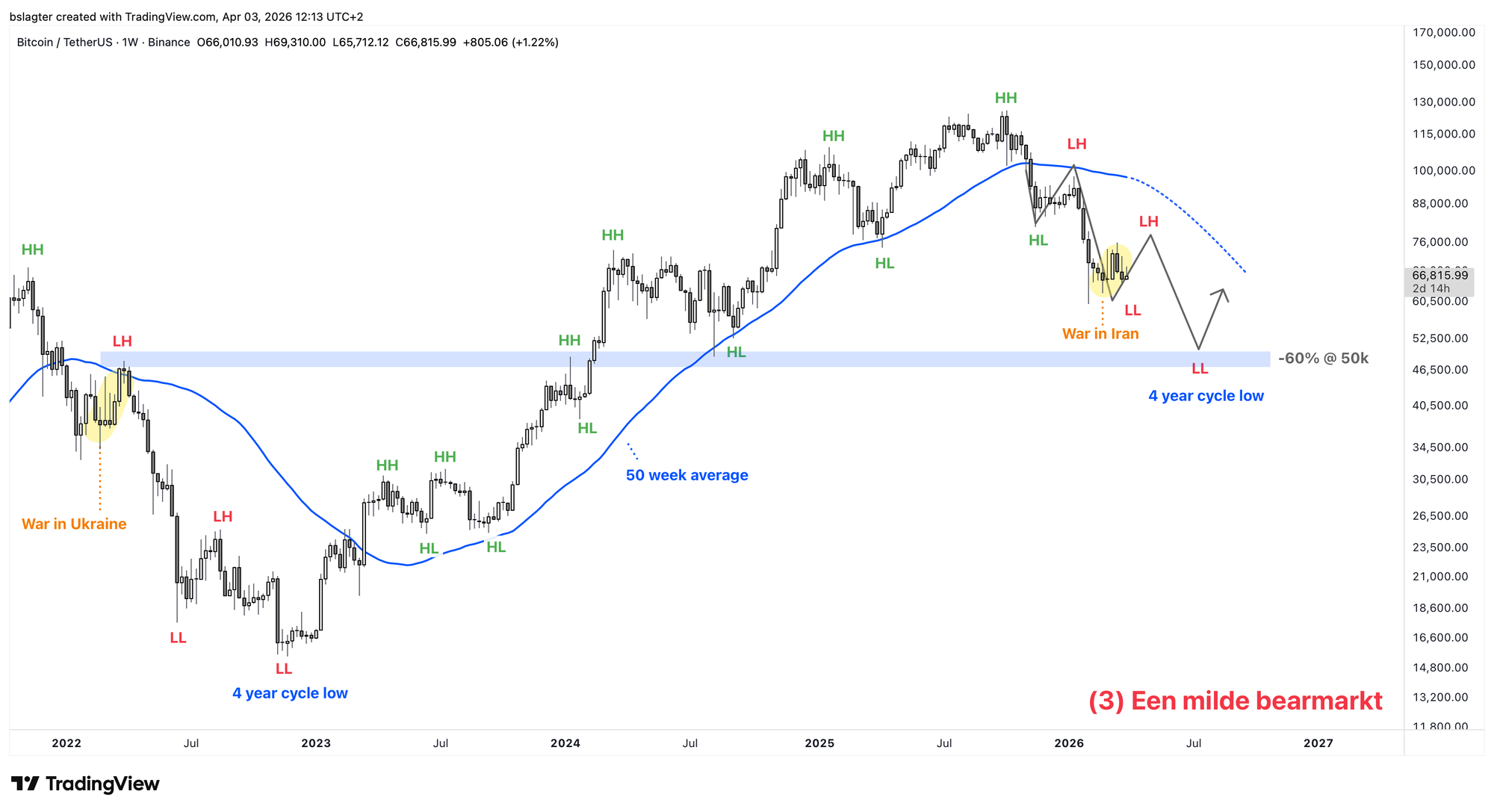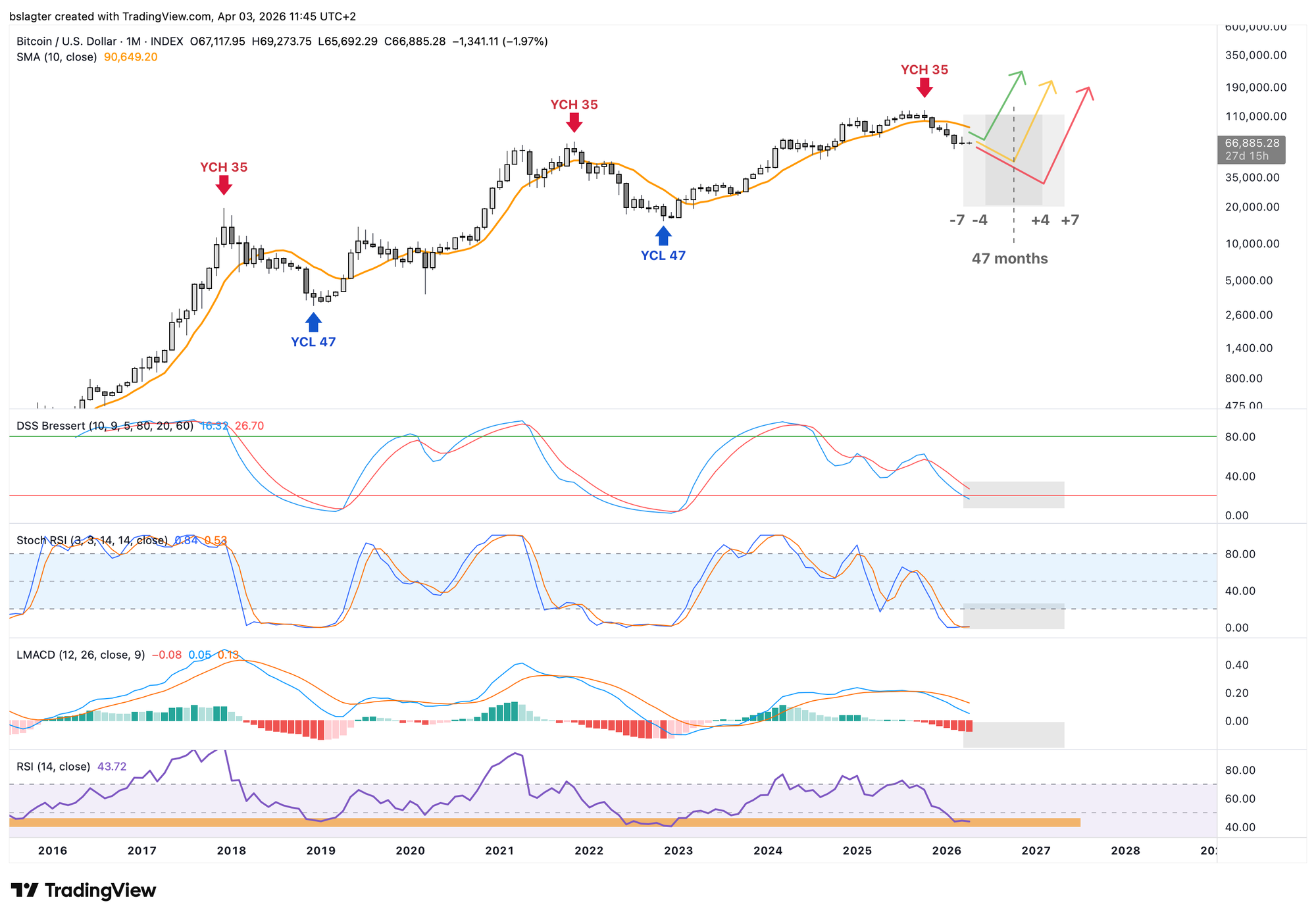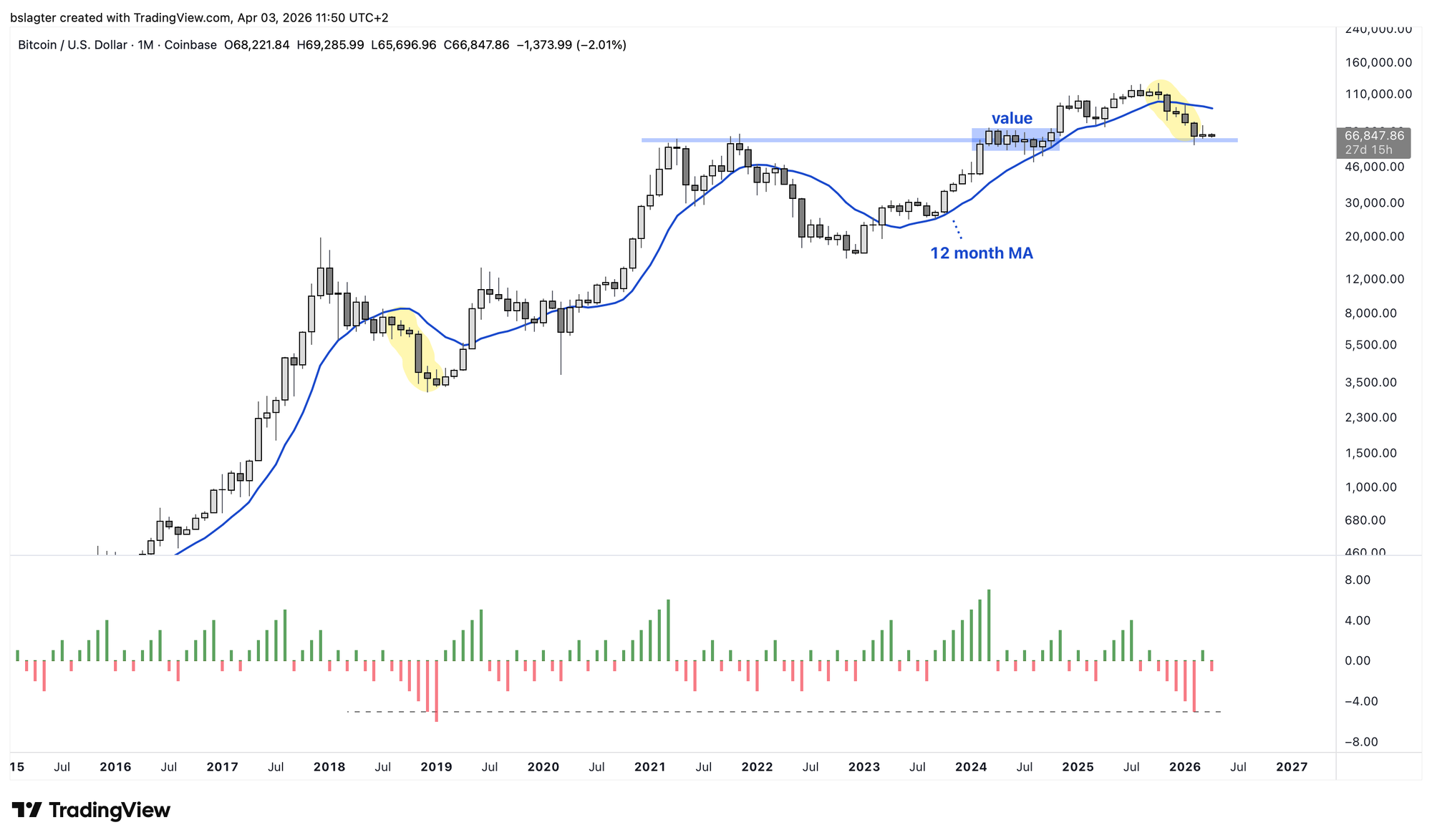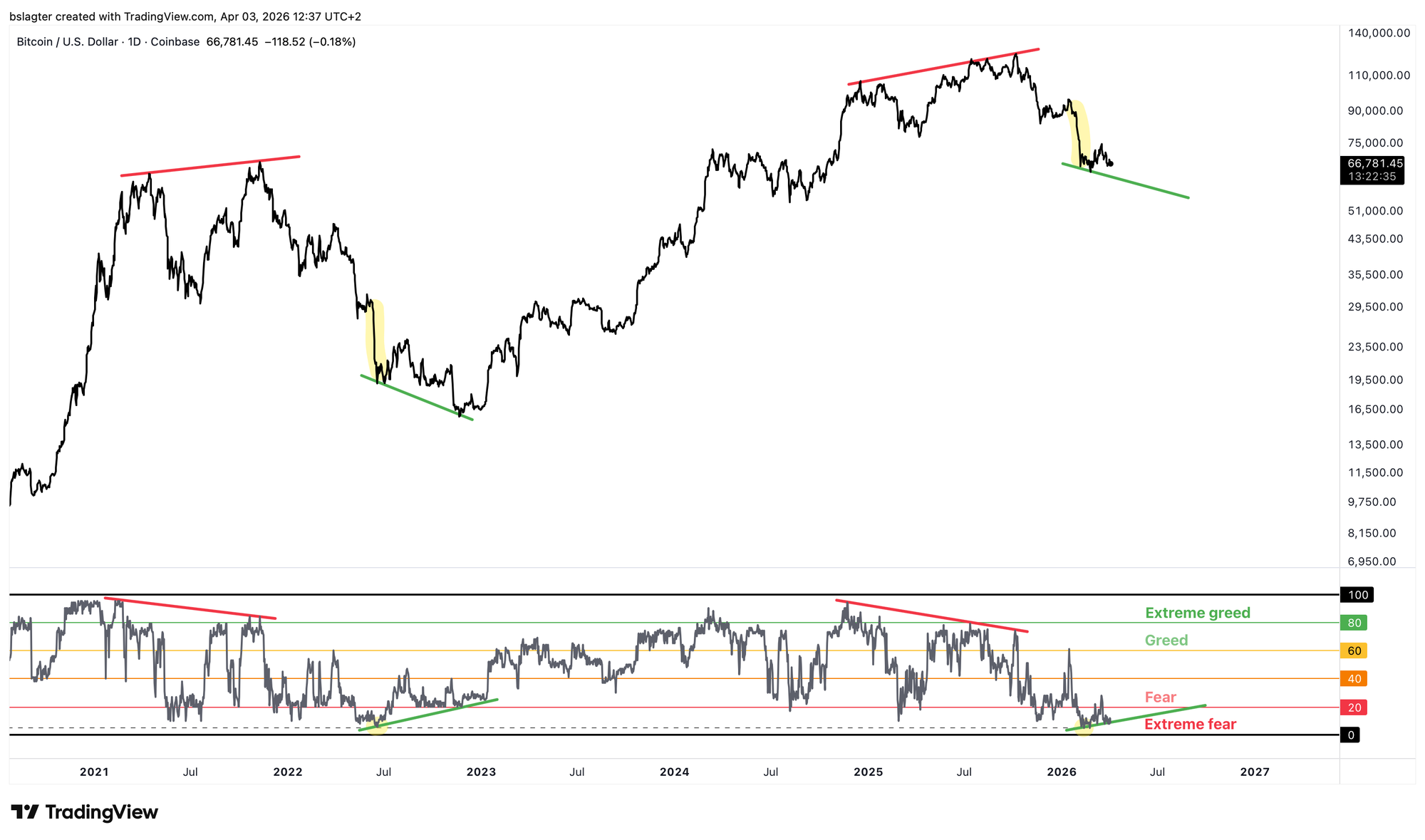 The 50-week moving average has been a reliable dividing line between bull and bear markets in recent years. That line currently sits at $97,000, which is still quite high, but will drop significantly in the coming months. If price stays around $67,000, the 50-week average will fall to $85,000 within three months. For investors looking to follow the market cycle, that would be an attractive entry point.