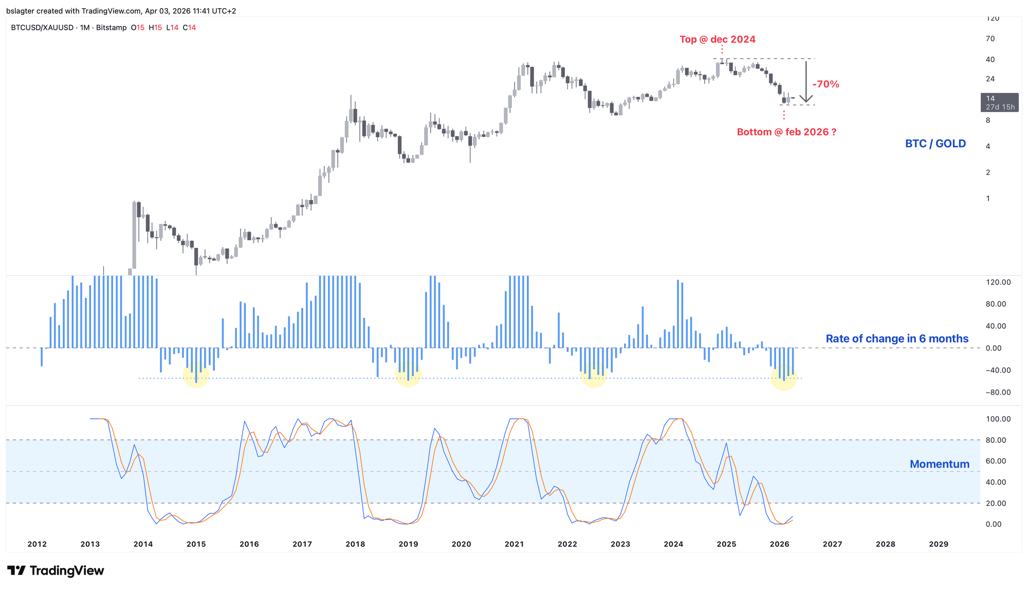 Measured in gold, December 2024 was the top, and bitcoin has been in a bear market for 15 months. It's possible that February was the bottom. In that case, we'd want to see this ratio continue rising in April.