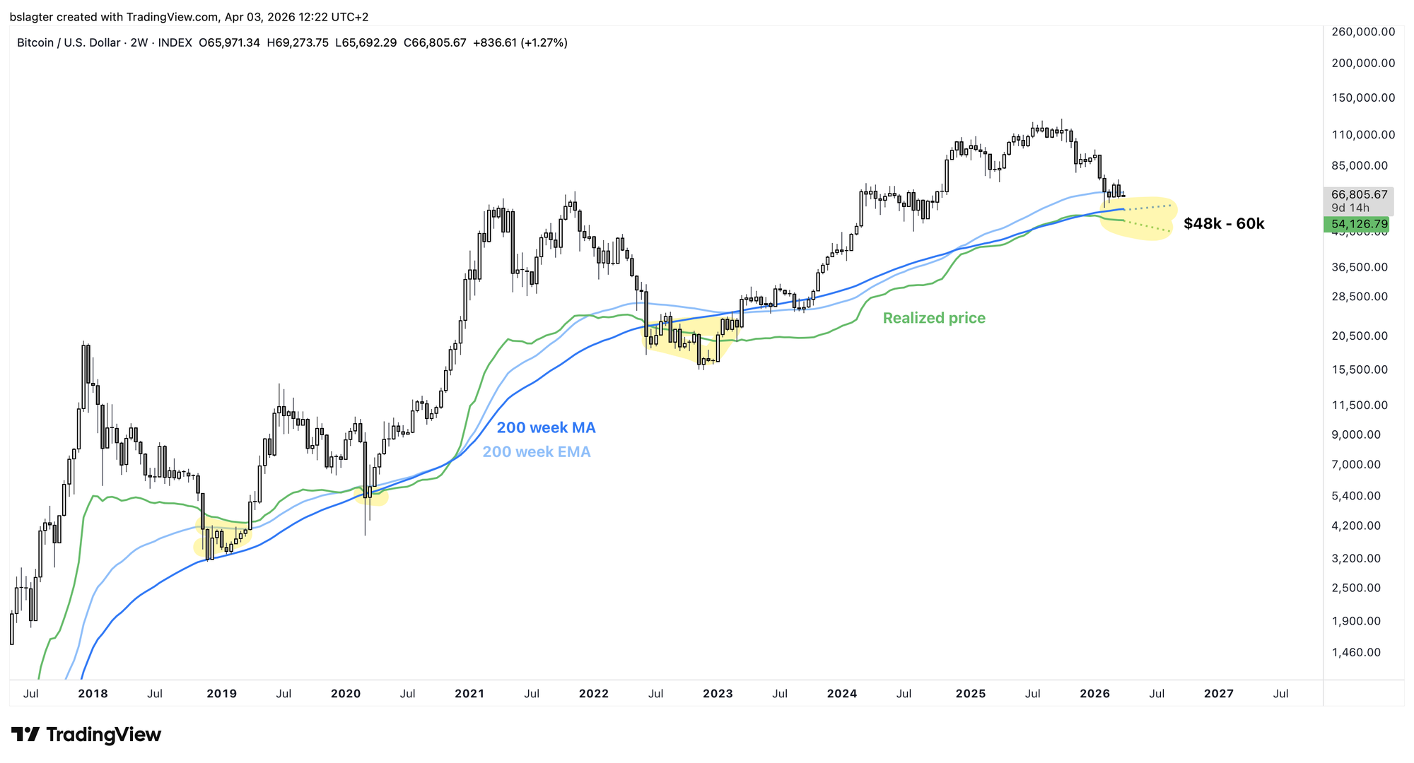 We often mention the $48,000 to $60,000 zone as interesting for a bottom. The chart below shows why. That's where the 200-week moving average and the realized price run. These have consistently formed the bottom in previous cycles.