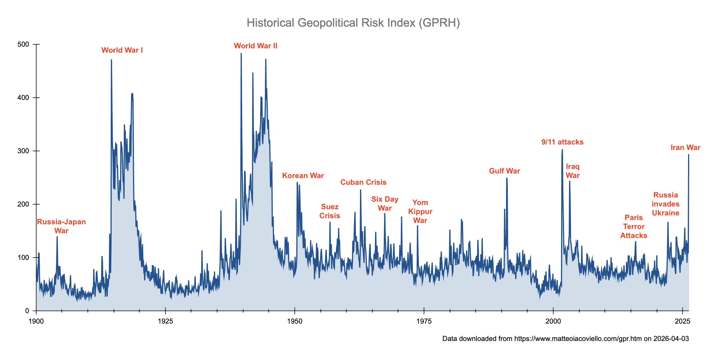 Dario Caldara and Matteo Iacoviello, two economists at the U.S. Federal Reserve, have been producing the Geopolitical Risk Index (GPR) for years. They do so by analyzing newspaper content. To obtain a long data series, they went all the way back to 1900. A chart with their data is shown below.