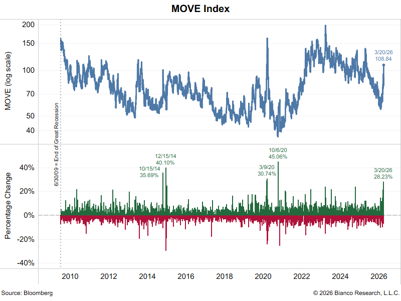 On Friday, March 20, implied volatility in the U.S. bond market (MOVE) suddenly exploded by 28%. That was the largest spike since October 2020. Since the 2008 financial crisis, there have been only four trading days on which the MOVE index surged even more.