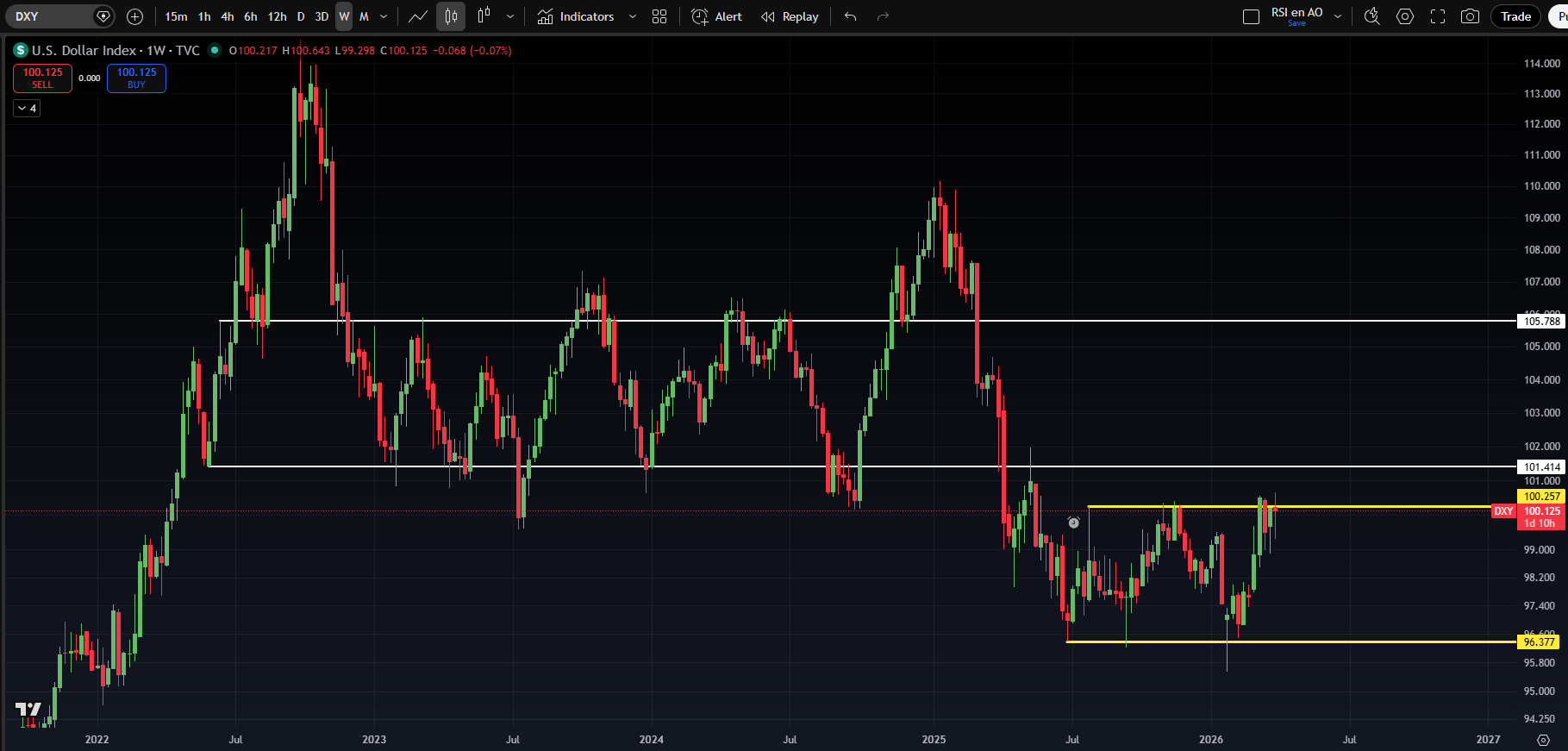 In the chart below, you can see that the DXY has been moving sideways since July 2025 between the yellow lines. Price is currently pressing against the upper boundary of the range. If it breaks out to the upside and eventually clears the lower white line, it could trigger a significant dollar rally.