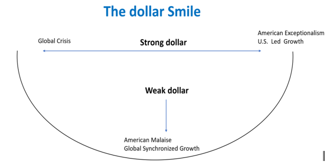 The second reason is known as the 'Dollar Smile Theory.' This theory by Stephen Jen posits that the dollar strengthens in two extreme economic scenarios: fear/recession or U.S. economic strength. Given all the uncertainty and falling stock markets, the market appears to be pricing in the first scenario in particular.