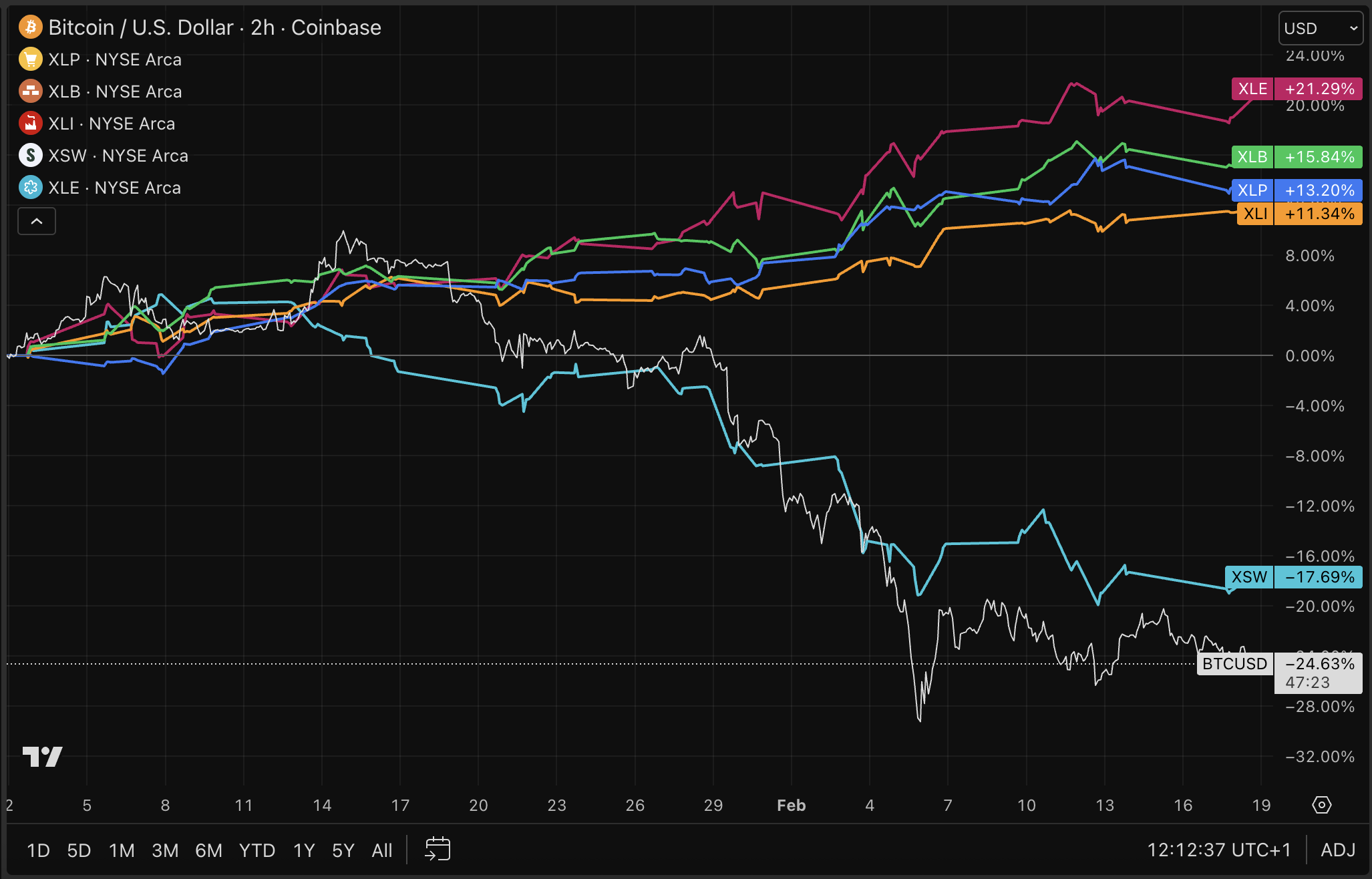 Although the S&P 500 and Nasdaq 100 are still only a few percentage points below their all-time highs, sentiment feels fragile. Investors are clearly rotating toward tangible sectors. While bitcoin and software (XSW) have been going through a deep valley since October 2025, consumer staples (XLP), industrials (XLI), materials (XLB), and energy (XLE) are showing strong performance.