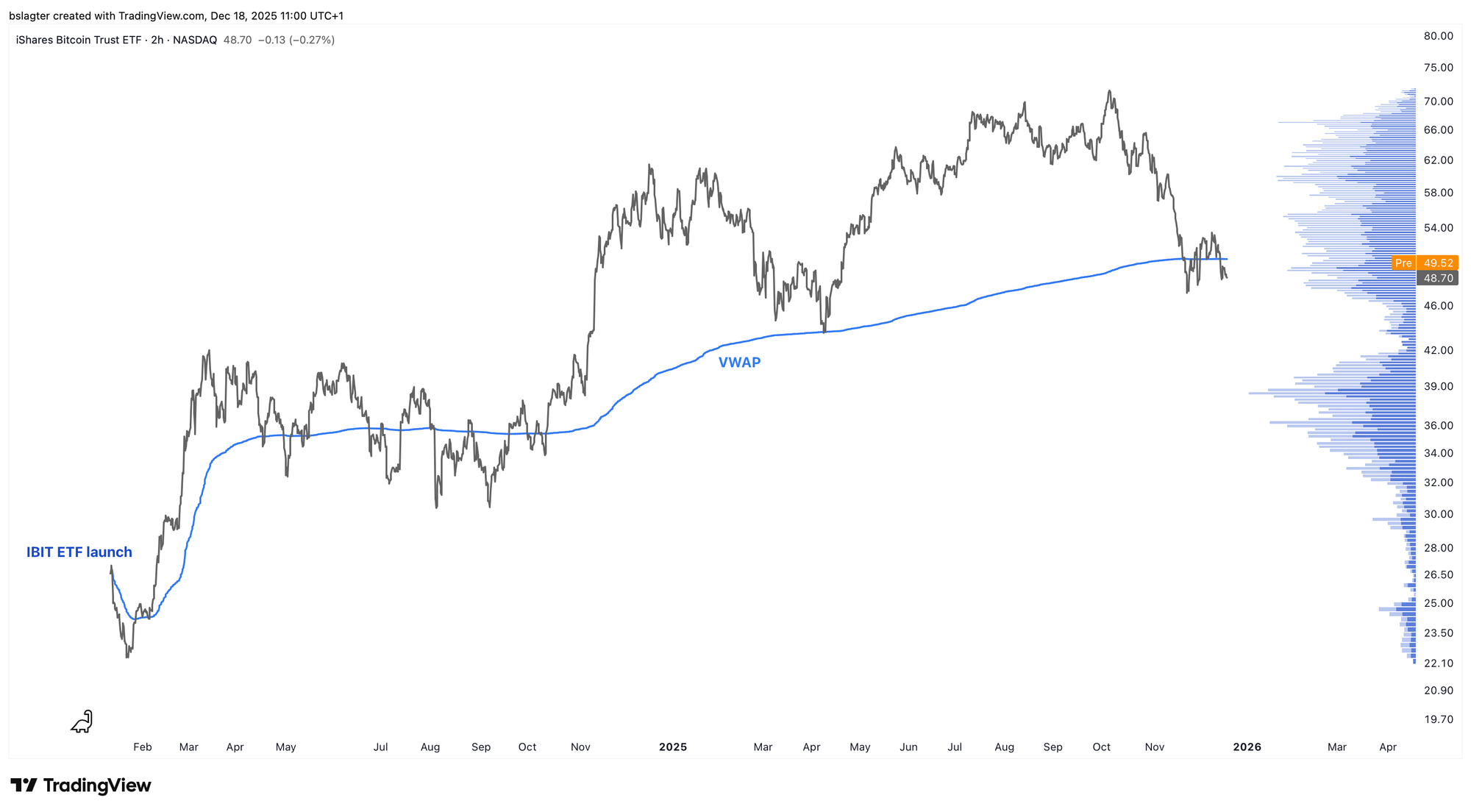 The price of IBIT, BlackRock's spot bitcoin ETF, has been oscillating around its VWAP in recent weeks, the volume-weighted average. You could say that all paper profits have evaporated, or that roughly half of investors are underwater.