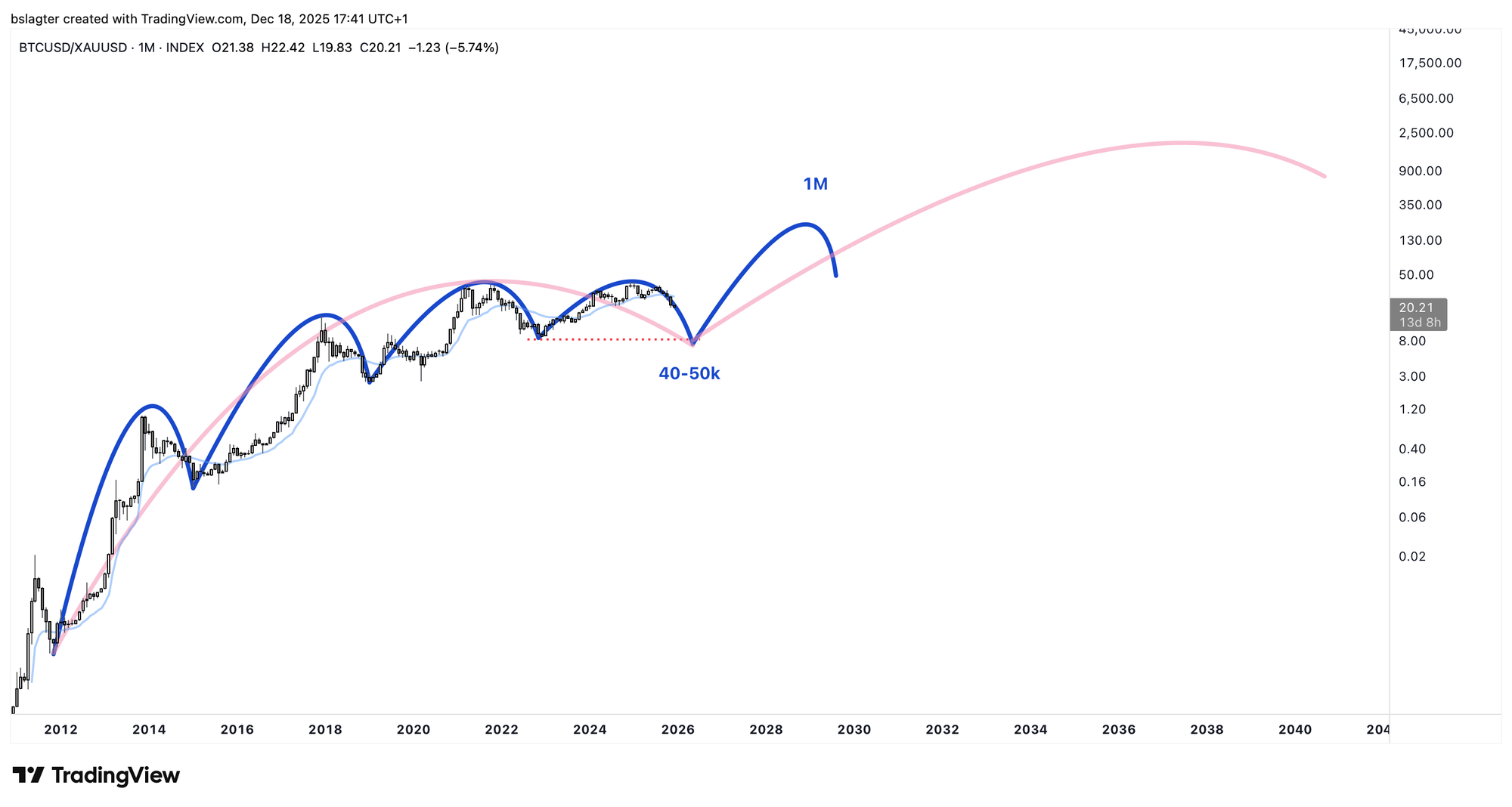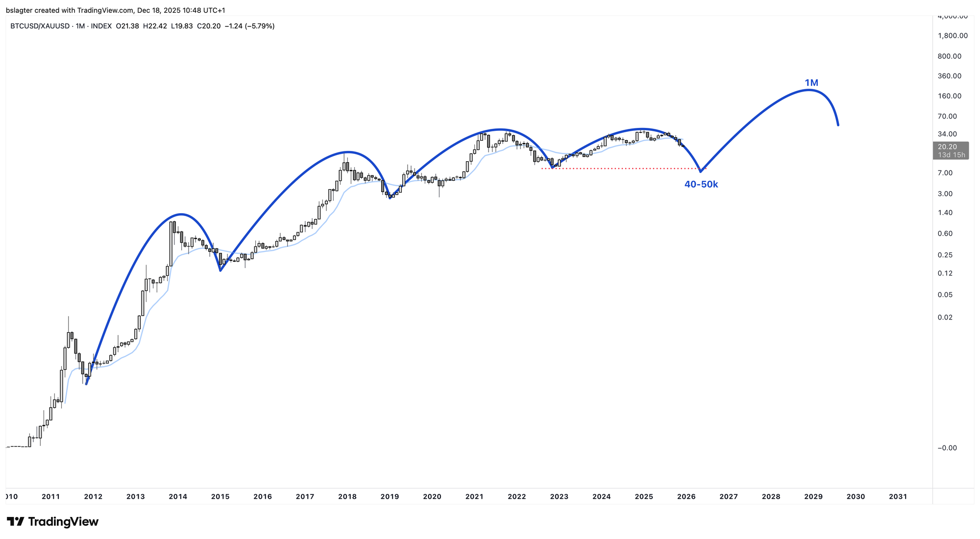 The chart below shows bitcoin expressed in gold. And viewed this way, this bull market indeed hasn't gone higher than the previous one, and we would already finish lower at a price of $40-50,000.