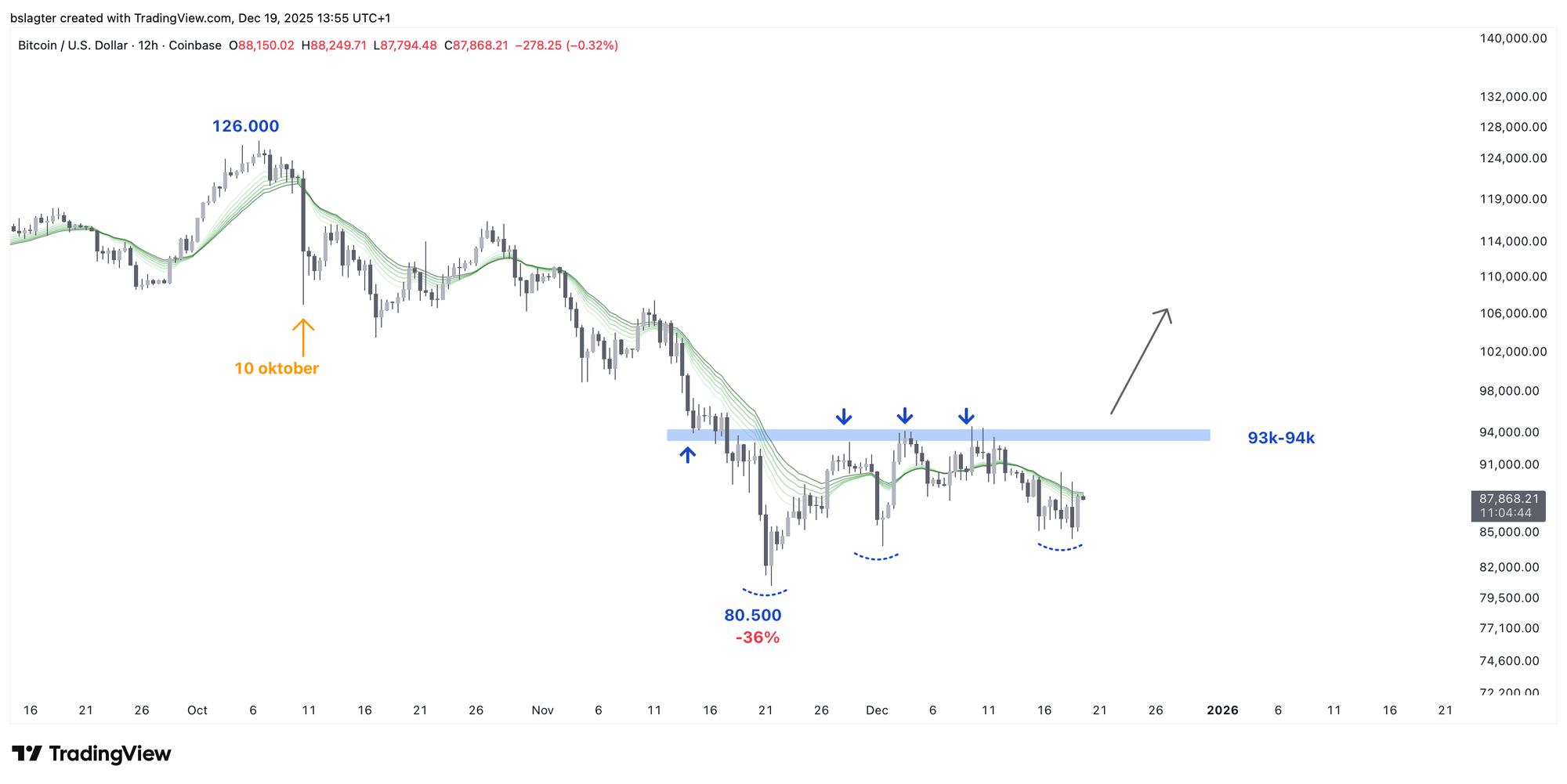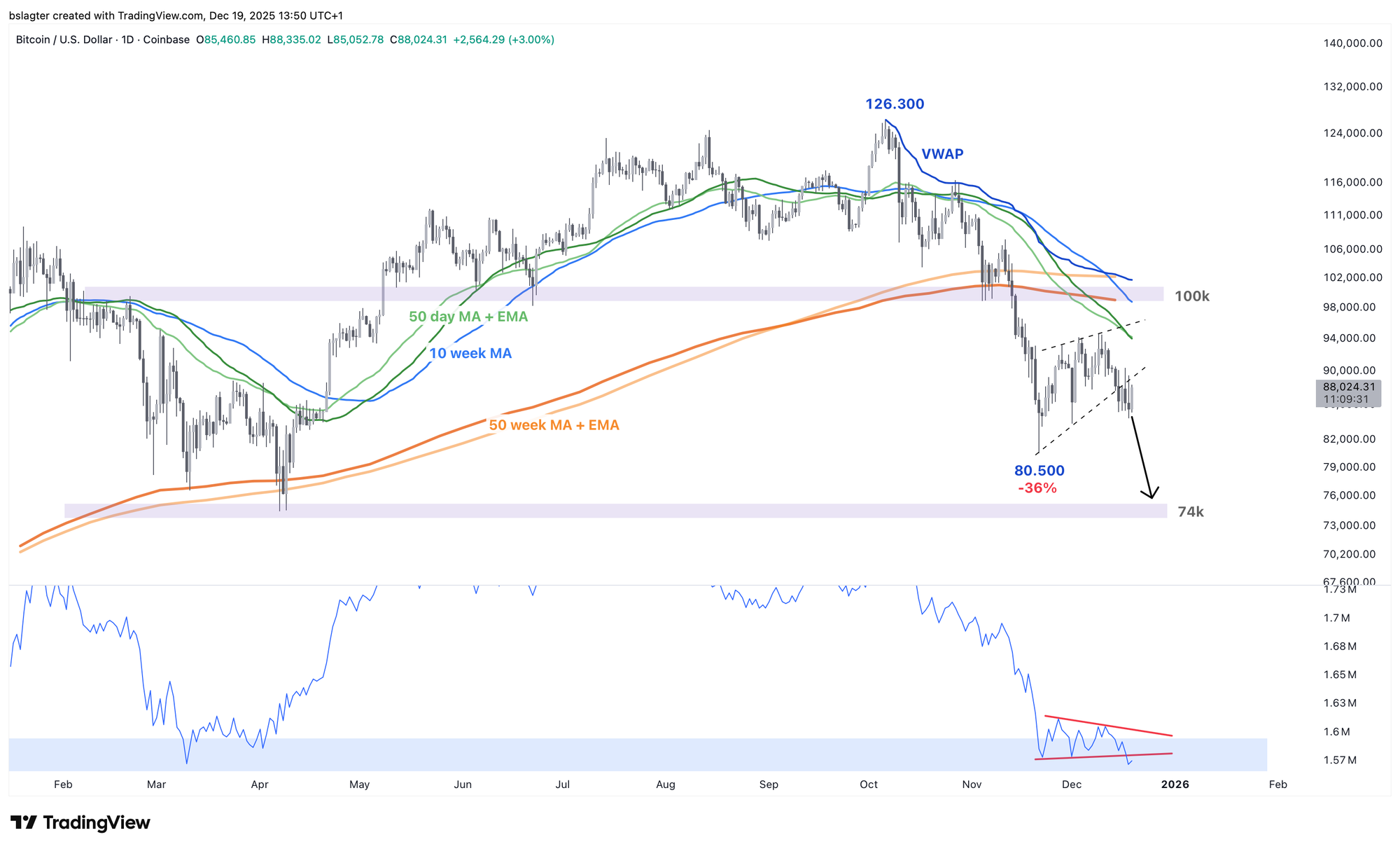 The pessimistic chart sees a rising wedge or bear flag, a pattern that favors continuation of the downtrend. A logical price target would then be the zone around $74,000. That was the bottom in April 2025 and the top in March 2024.