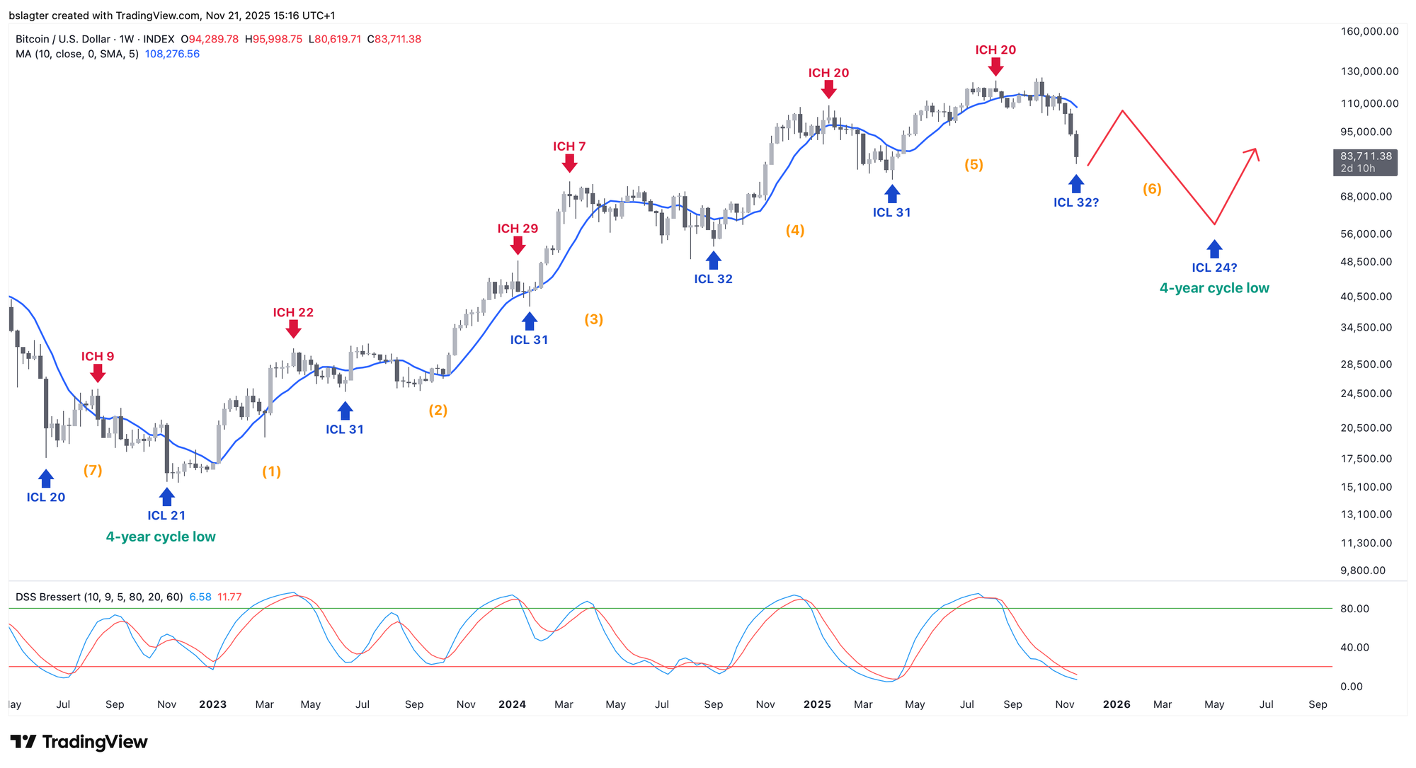 - Will it take us to a top that is lower than $126,000? That would be a lower high (LH) on the weekly chart, and thus confirmation of the end of the bull market. Scenarios 2 through 4.