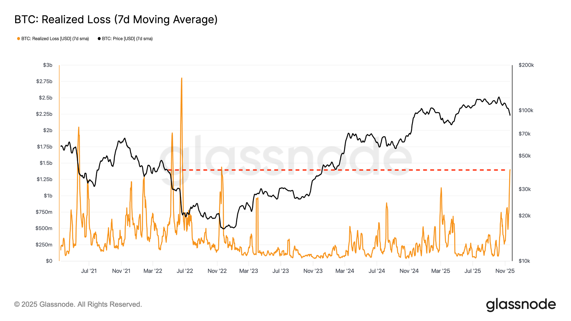 For the first time this market cycle, we are seeing signs that existing investors have given up hope: capitulation. The 7-day moving average of realized loss in the on-chain data is at its highest point since the fall of FTX in November 2022.