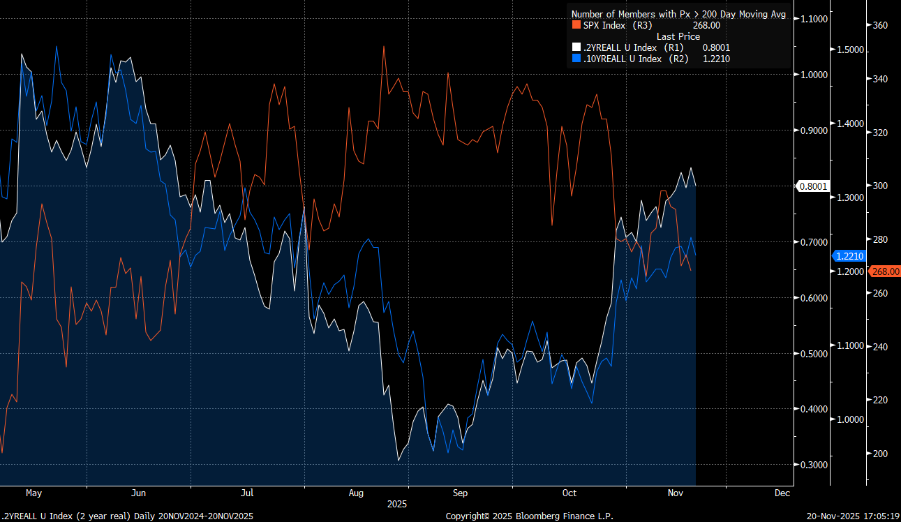 Since that moment, risk assets have come under pressure. The slide of the S&P 500, orange in the chart below, began when real interest rates started to rise, white and blue in the chart.