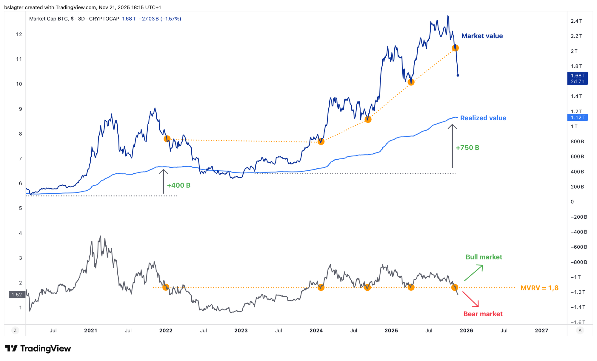 The chart below shows the MVRV, the ratio between market value (MV) and realized value (RV). Because the MV is decreasing and the RV is remaining constant, the MVRV is also decreasing.